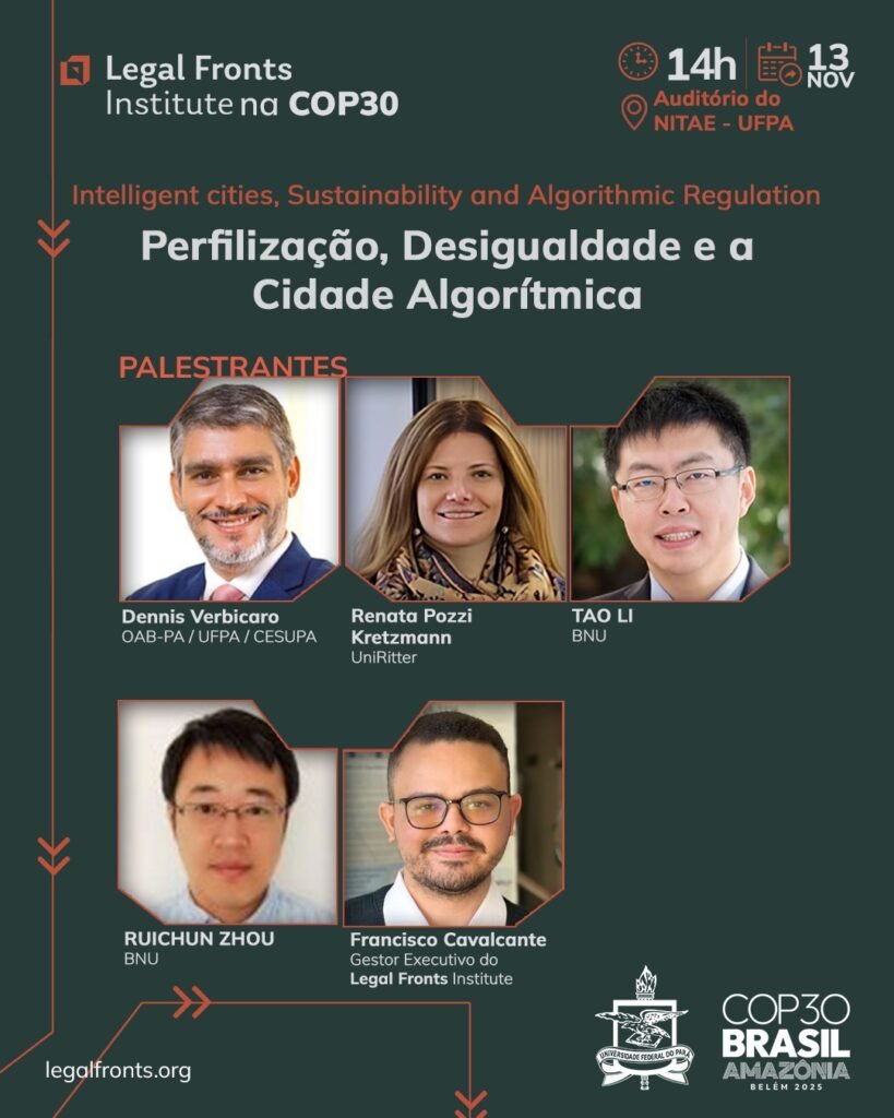 Nos dias 13 e 14 de novembro, o Legal Fronts Institute participou da 30ª Conferência das Nações Unidas sobre Mudanças Climáticas (COP30), em Belém (PA), integrando o evento “Cidades Inteligentes, Sustentabilidade e Regulação Algorítmica”, promovido pela Universidade Federal do Pará (UFPA) e pelo Grupo de Pesquisa Consumo e Cidadania e Globalização Econômica (CNPq).